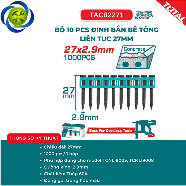 Bộ 10 pcs đinh bắn bê tông liên tục 27mm TOTAL TAC02271