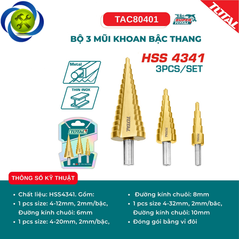 Bộ 3 mũi khoan bậc thang TOTAL TAC80401