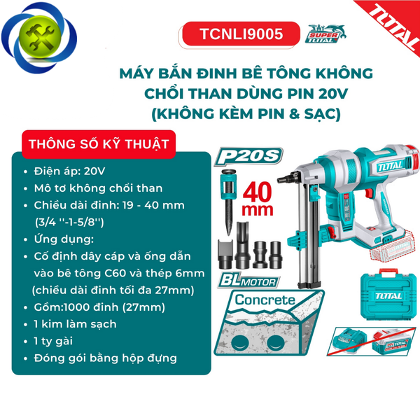 Máy Bắn Đinh Bê Tông TOTAL TCNLI9005 Không Chổi Than Dùng Pin 20V (Không Kèm Pin & Sạc)