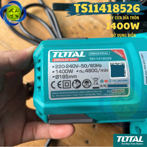 • Đặc Điểm: Sản phẩm này là máy cưa đĩa tròn TOTAL TS11418526 với công suất 1400W, sử dụng điện.