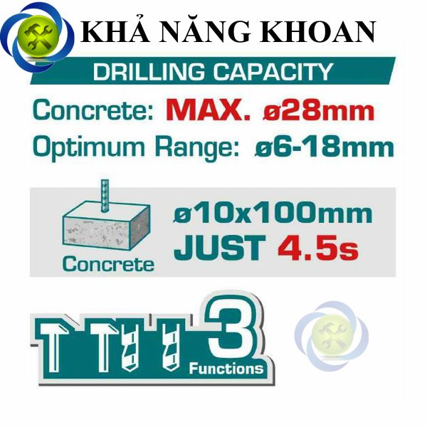 - Khả năng khoan tối đa: Bê tông: 28mm/ Thép: 13mm/ Gỗ: 40mm
