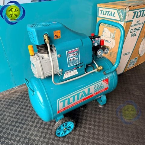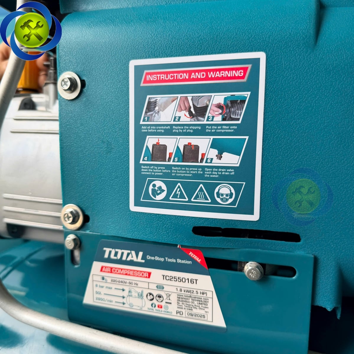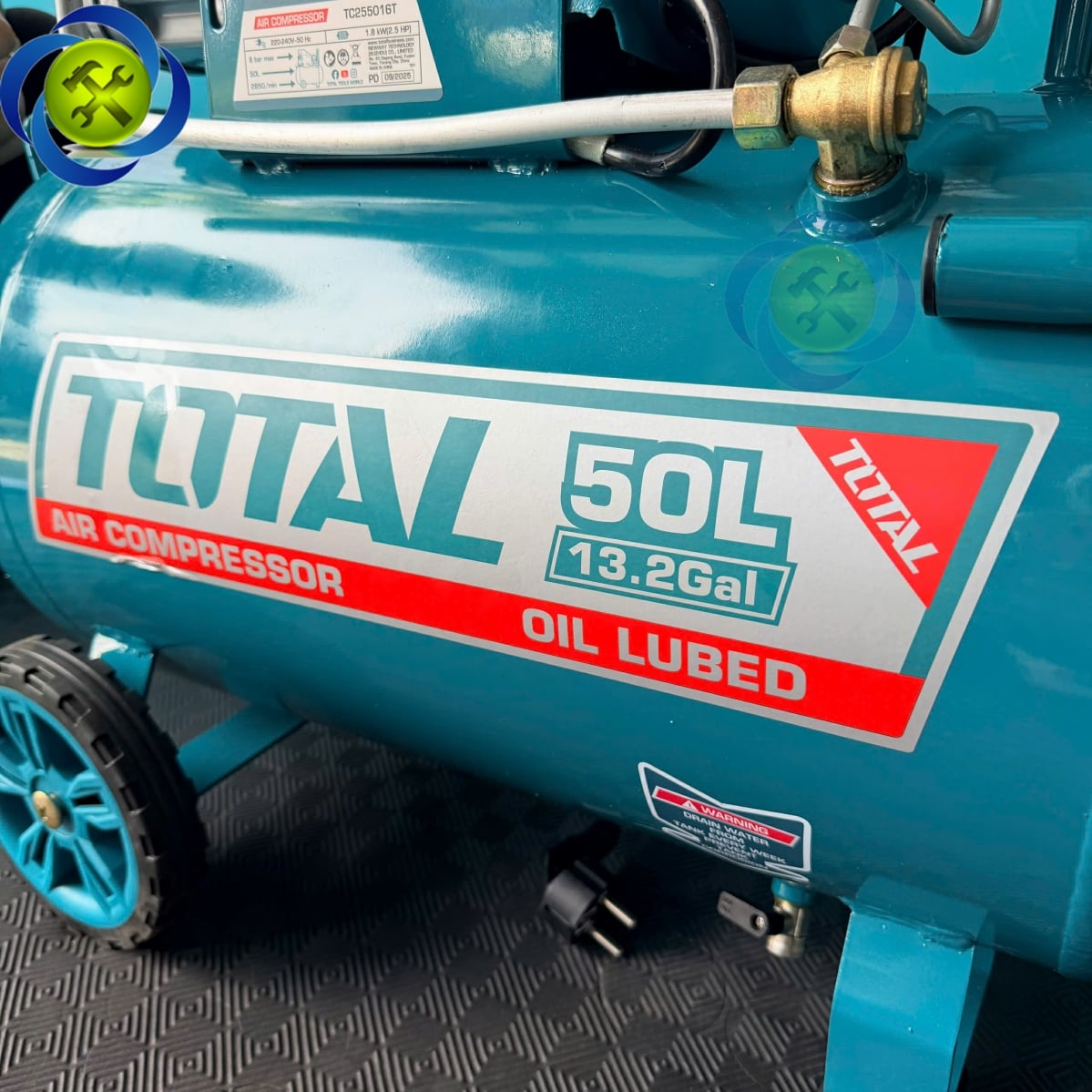 Thông số kĩ thuật - Mã sản phẩm: TC255016T - Thương hiệu: Total - Xuất xứ: Trung Quốc - Điện áp: 220-240V~50Hz - Công suất: 1.8kW (2.5HP) - Bình chứa: 50L (13.2Gal) - Độ ồn: 96dB - Bộ bơm: Bôi trơn bằng dầu - Tốc độ không tải: 2850 vòng/phút - Áp suất hoạt động: Tối đa 8bar