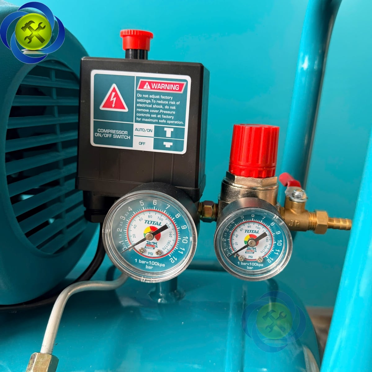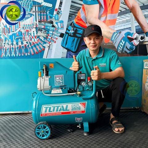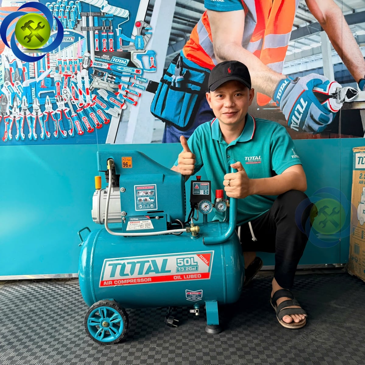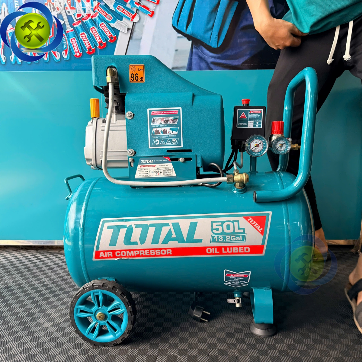 Thông số kĩ thuật - Mã sản phẩm: TC255016T - Thương hiệu: Total - Xuất xứ: Trung Quốc - Điện áp: 220-240V~50Hz - Công suất: 1.8kW (2.5HP) - Bình chứa: 50L (13.2Gal) - Độ ồn: 96dB - Bộ bơm: Bôi trơn bằng dầu - Tốc độ không tải: 2850 vòng/phút - Áp suất hoạt động: Tối đa 8bar