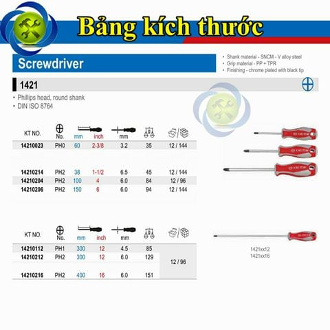 - Vật liệu thân - thép hợp kim SNCM + V - Vật liệu tay cầm - nhựa PP + TPR - Hoàn thiện - mạ crôm với đầu đen cso từ tính nam châm - Đầu bake (+) chuôi tròn. - Kích thước hệ mét - Tiêu chuẩn DIN ISO 8764