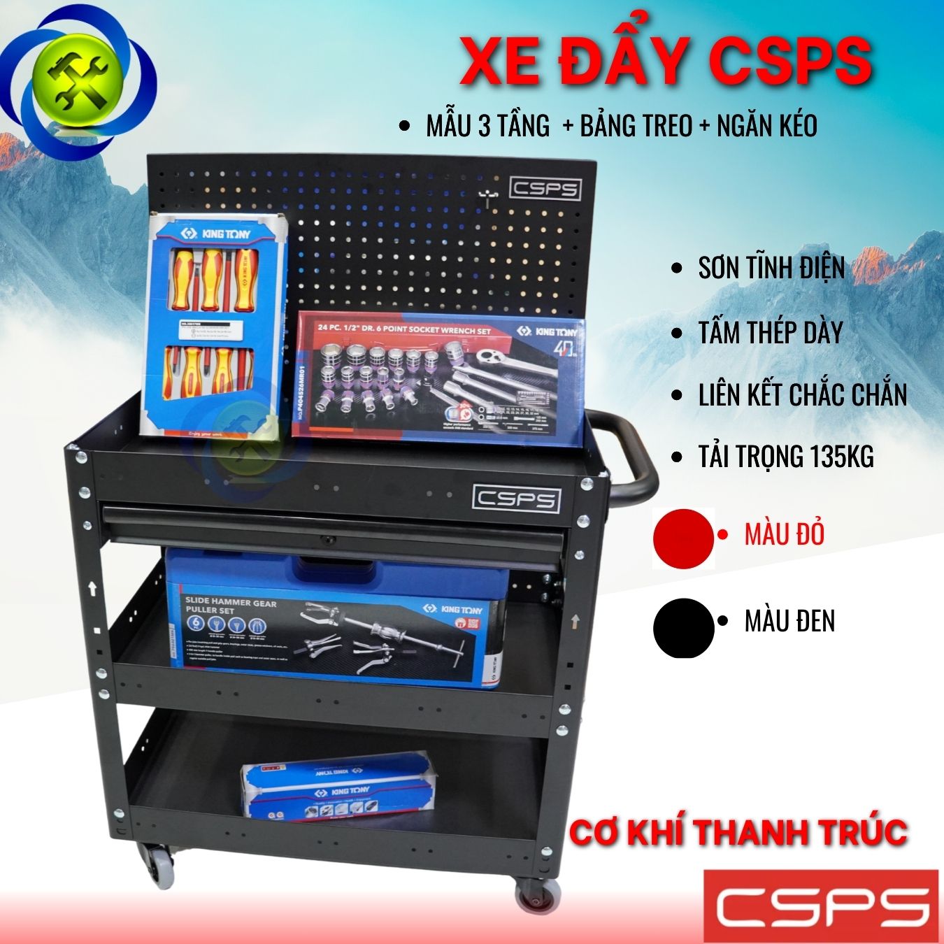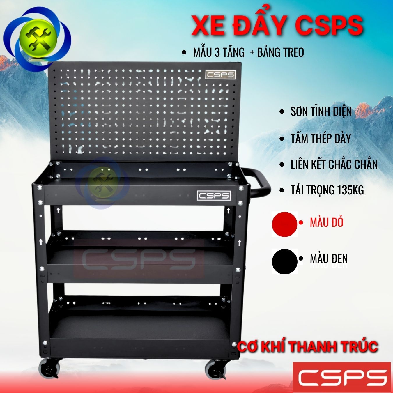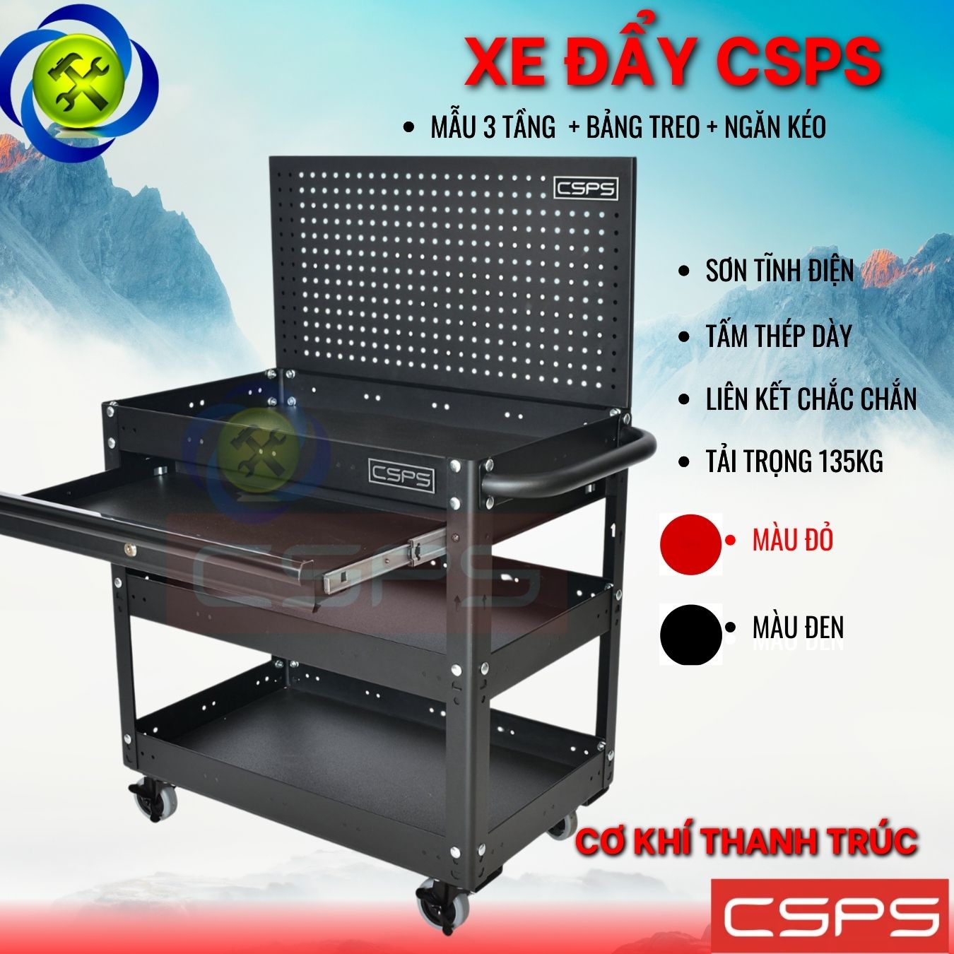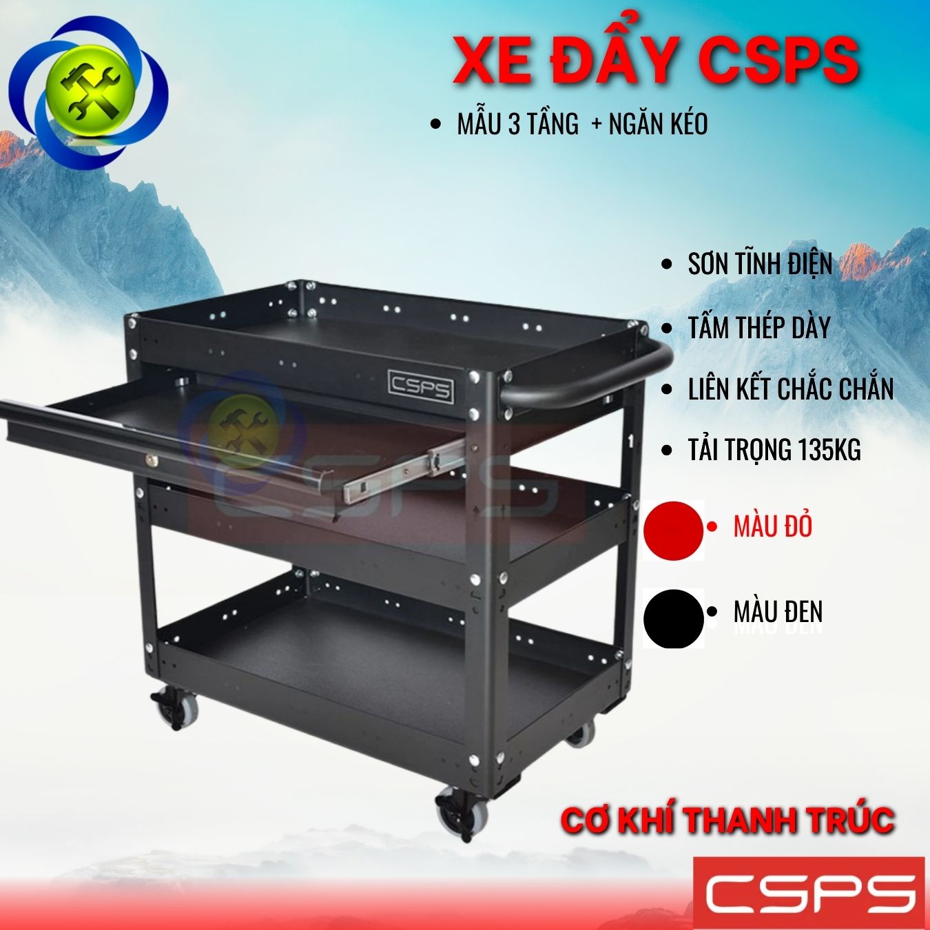 Xe đẩy 3 tầng có hộc kéo và vách lưới màu đỏ là một thiết kế mới của CSPS dành riêng cho người thợ Việt Nam với các lợi ích nổi bật: / Trolley 3 levels with drawers and mesh walls black is a new design of CSPS exclusively for Vietnamese workers with outstanding benefits.