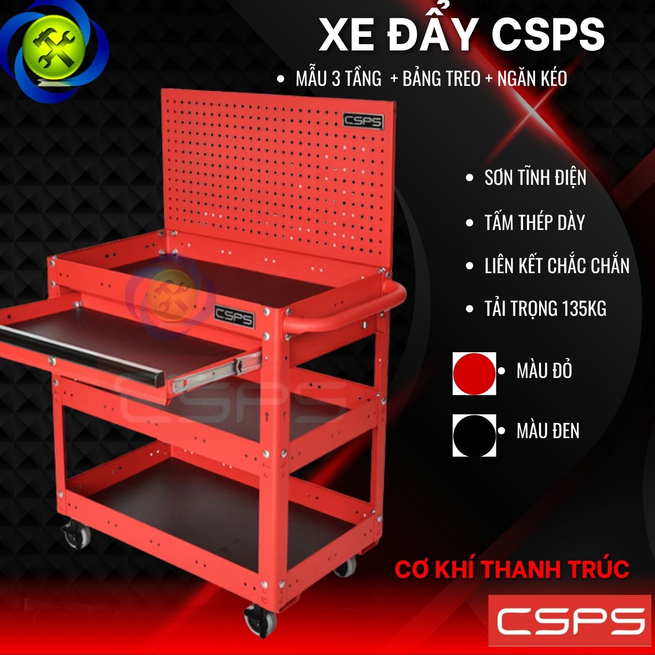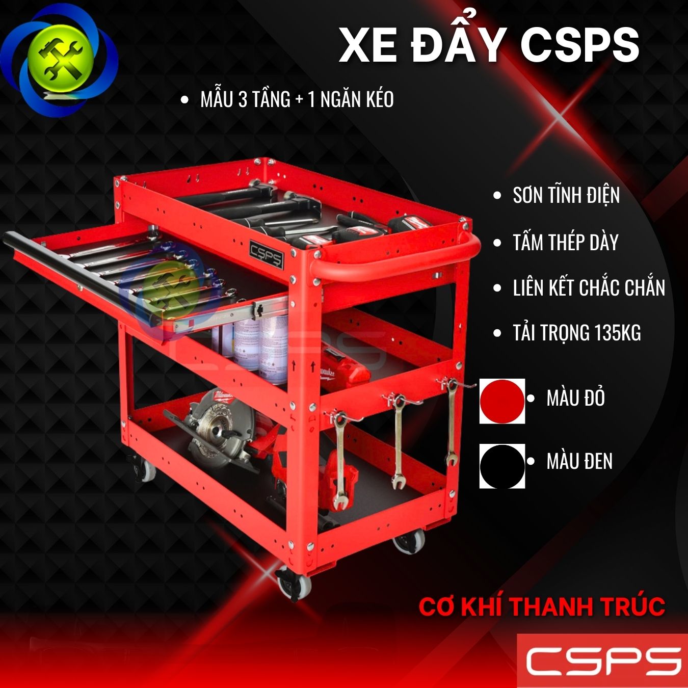 Xe đẩy 3 tầng có hộc kéo và vách lưới màu đỏ là một thiết kế mới của CSPS dành riêng cho người thợ Việt Nam với các lợi ích nổi bật: / Trolley 3 levels with drawers and mesh walls black is a new design of CSPS exclusively for Vietnamese workers with outstanding benefits.